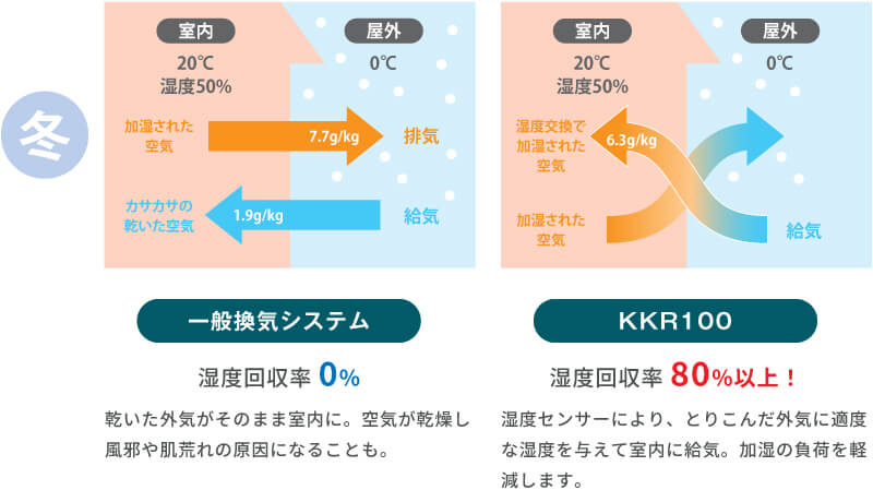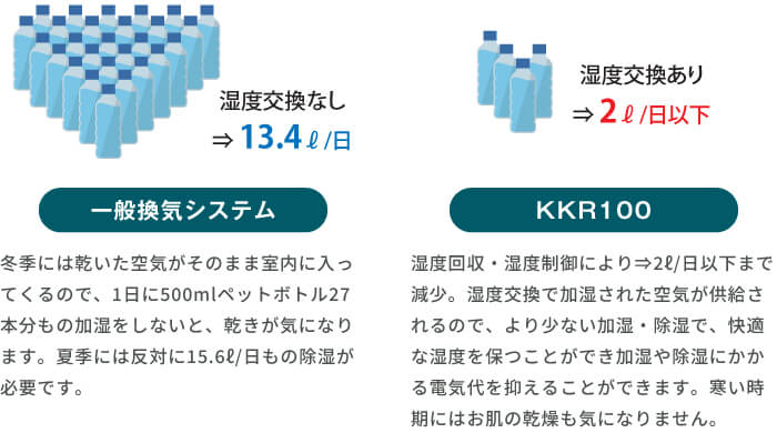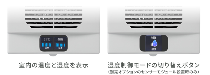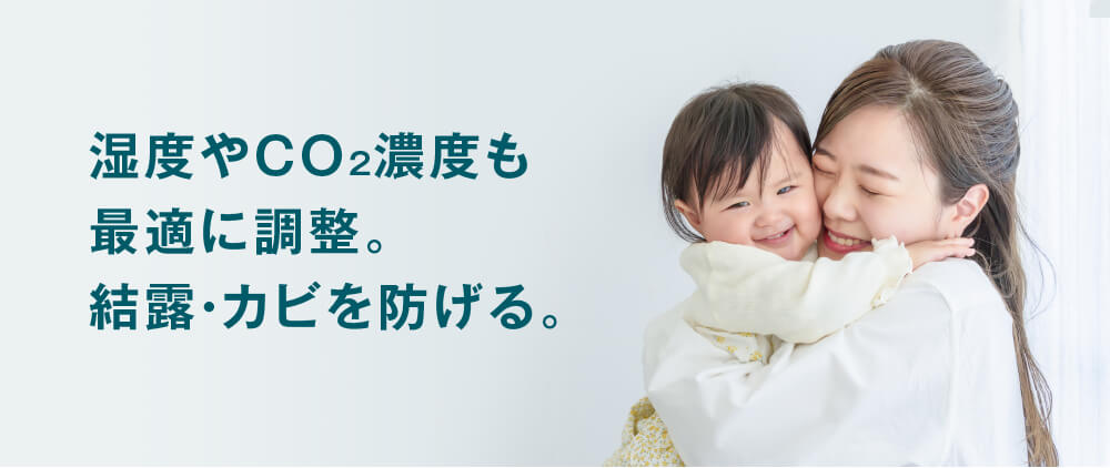 KKR100の湿度センサーモジュール(別売オプション)により室内の湿度を監視、快適な湿度を保つようコントロールするデマンド制御換気を行い、空気中に含まれた水分を適切に保ち、結露を防いでカビの発生を抑制し、つねに快適な空気の状態を維持。