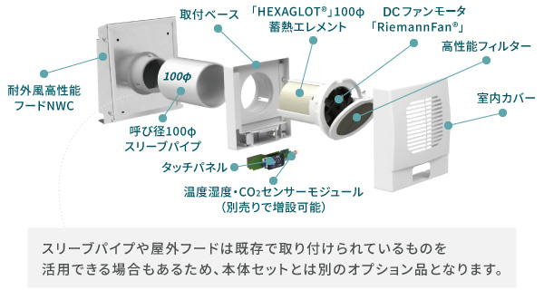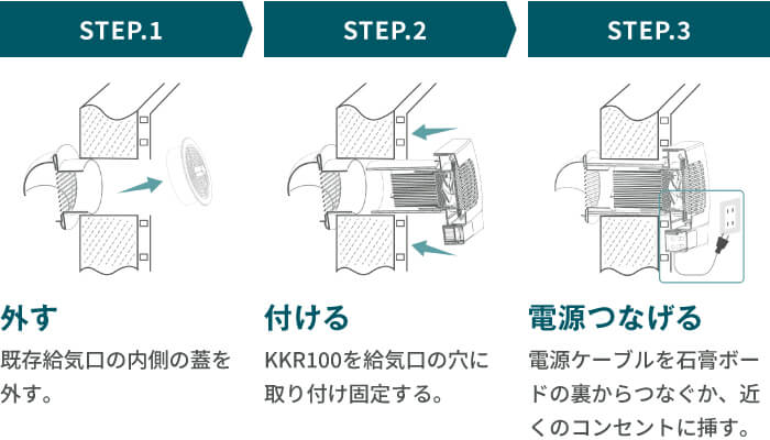 これまではハウスメーカー様向けに住宅新築時に設置するダクトレスのHRVを提供してまいりましたが、今回の「快適換気リフォーム KKR100」は径100φの既存給気口に取付可能で、既存住宅やマンションのリフォームにも対応可能です。