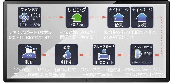 湿度センサーにより反転時間を30秒〜150秒の間隔で調整し、室内の湿度を制御します。